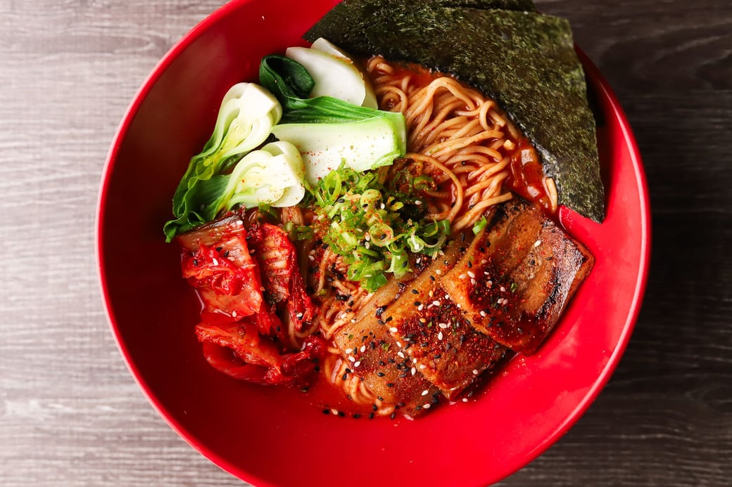 Plant-based "Pork-Belly",Ramen Noodles,Kimchi,Bockhoy,Green Onion,Sesame Seeds,White Onion,Garlic with Spicy Miso Broth.