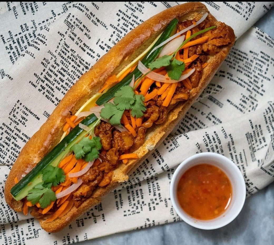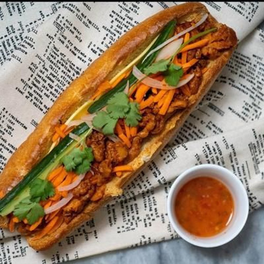 Spicy lemongrass "chicken", Crusty Baguette, Choice of Sriracha or Regular Mayo, Pickled Carrots, Cucumber, Onions, Secret Sauce, and Cil...